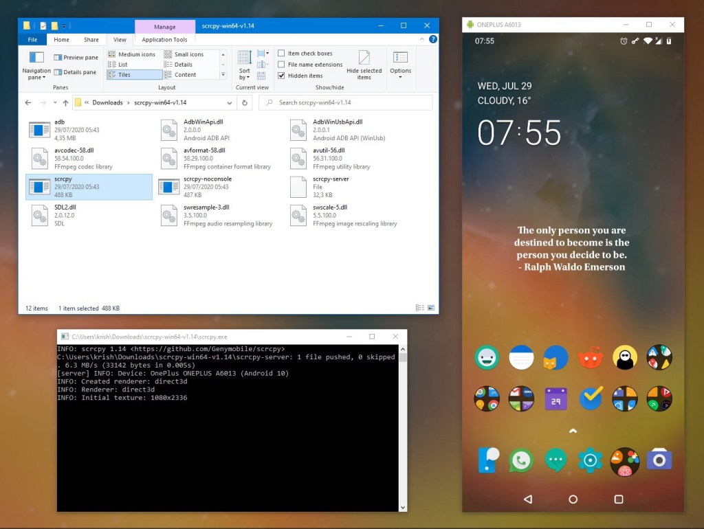 scrcpy es una aplicación open source (para Linux, Windows y macOS) que permite duplicar y controlar la pantalla de un celular conectado por USB a la computadora. También puede hacerlo por red TCP/IP. No requiere permisos de root en el celular ni instalka ninguna app en el celular. Solamente necesita que esté habilitado el «USB Debugging».