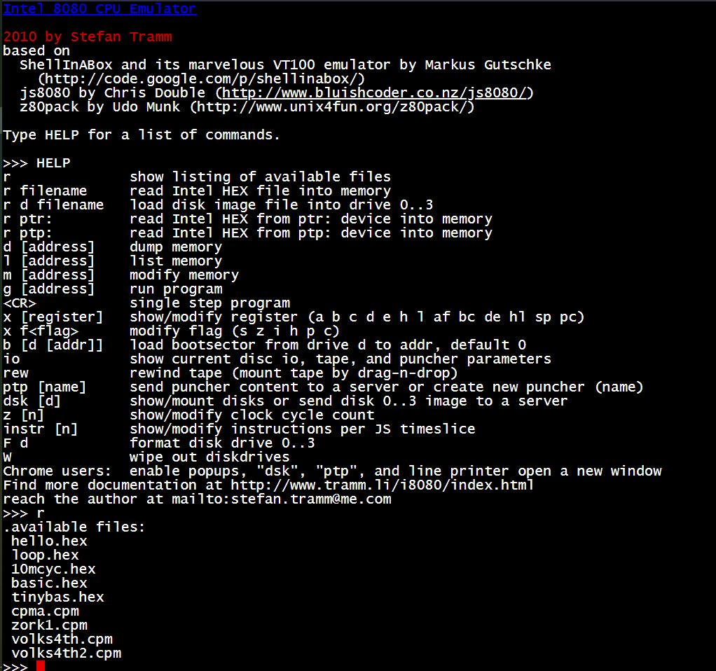 En este sitio web hay un emulador de CP/M realizado por Stefan Tramm en 2010. Por ejemplo, ejecutar estos comandos:
