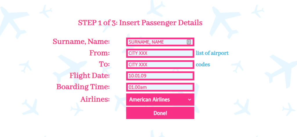 Ticket-O-Matic es un sitio gratis para generar pasajes aéreos de fantasía. Para crear un pasaje hay que ingresar el nombre del pasajero, el aeropuerto de origen y de destino (los aeropuertos se ingresan por su código), fecha y hora del vuelo, y la aerolínea preferida (de una lista).