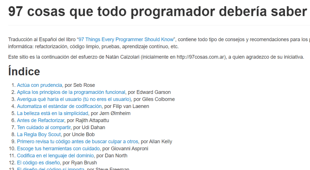 Esta página colecciona las recomendaciones -traducidas a Español- del libro “97 Things Every Programmer Should Know”, una lista extensa de consejos prácticos de diversos expertos. No hay una narrativa general: la colección pretende simplemente contener múltiples y variadas perspectivas sobre qué es lo que los contribuyentes del proyecto sienten que los programadores deberían saber. Esto puede ser cualquier cosa, desde consejos centrados en el código hasta la cultura, desde el uso de algoritmos hasta el pensamiento ágil, desde el conocimiento de la implementación hasta el profesionalismo, desde el estilo hasta la sustancia, etc.