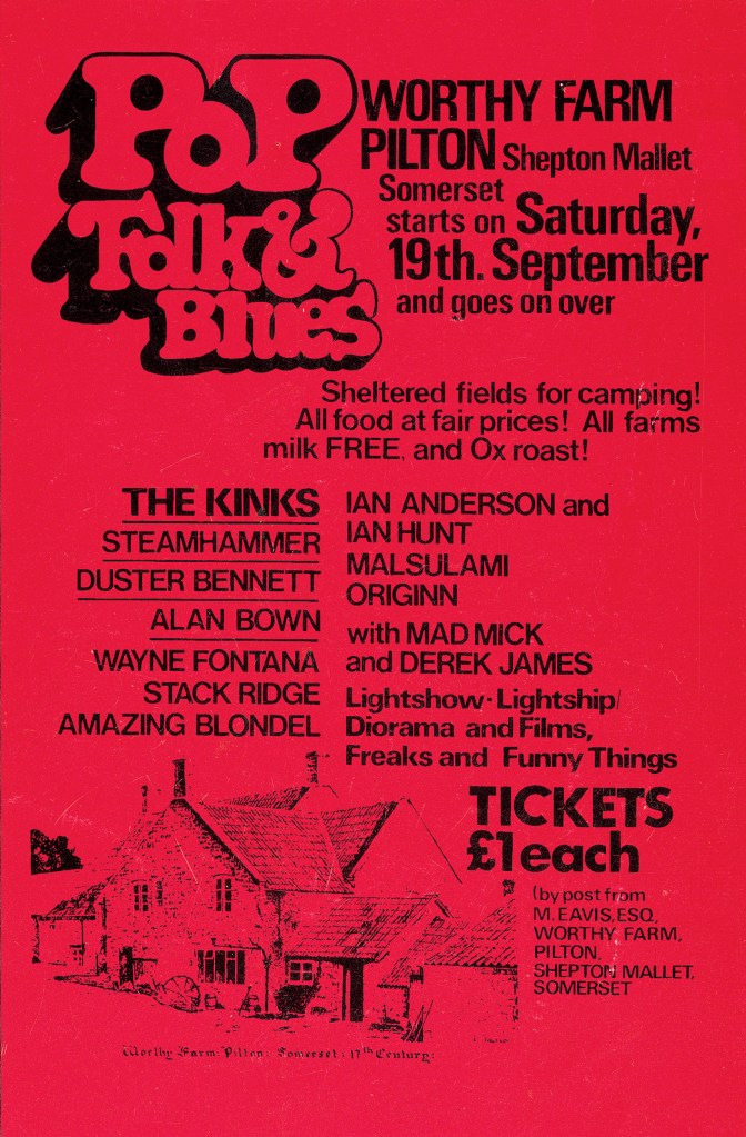 El primer festival Glastonbury (en Somerset, Inglaterra) fue el Pilton Pop, Blues & Folk Festival, organizado por Michael Eavis el sábado 19 de septiembre de 1970 y al que asistieron 1500 personas.