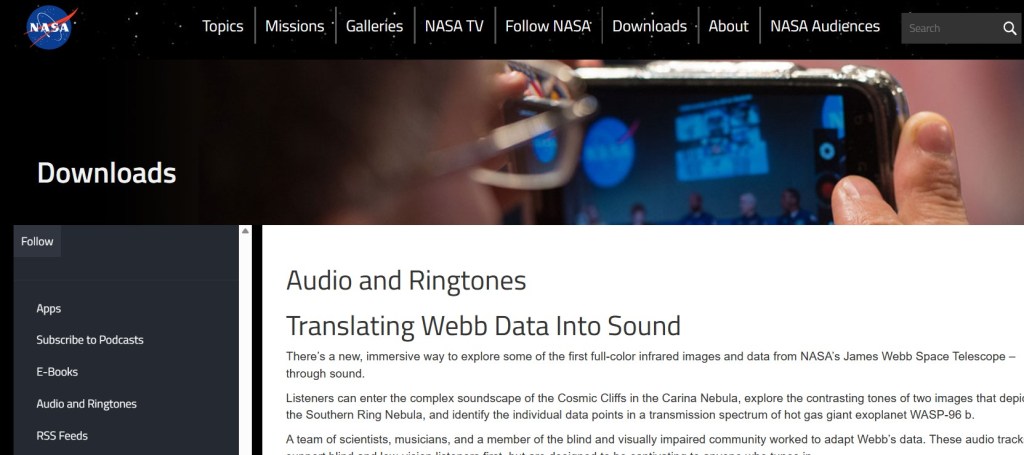 Entre otras cosas, se puede explorar algunas de las primeras imágenes y datos infrarrojos a todo color del Telescopio Espacial James Webb de la NASA, a través del sonido. Los oyentes pueden ingresar al complejo paisaje sonoro de los Acantilados Cósmicos en la Nebulosa Carina, explorar los tonos contrastantes de dos imágenes que representan la Nebulosa del Anillo Sur e identificar los puntos de datos individuales en un espectro de transmisión del exoplaneta gigante de gas caliente WASP-96 b.