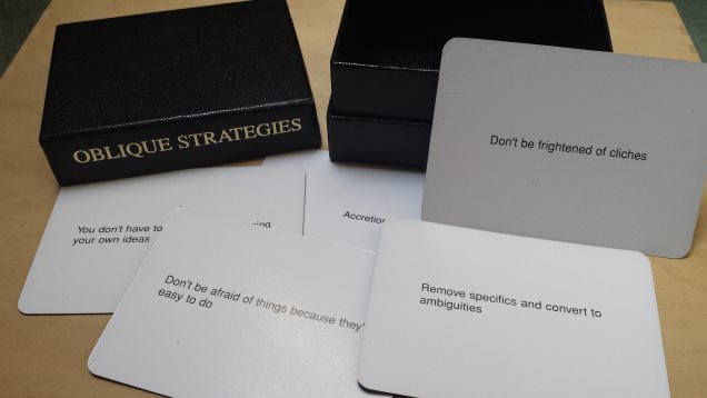 Oblique Strategies, en español «estrategias oblicuas» (subtitulado «Más de cien dilemas que valen la pena») es un método basado en cartas para promover la creatividad creado conjuntamente por el músico Brian Eno y el artista multimedia Peter Schmidt, publicado por primera vez en 1975. Físicamente, toma la forma de una baraja de tarjetas impresas de 7×9 centímetros (2,8 x 3,5 pulgadas) en una caja negra. Cada tarjeta ofrece una restricción desafiante destinada a ayudar a los artistas (en particular a los músicos) a romper los bloqueos creativos fomentando el pensamiento lateral. Cada tarjeta contiene una sugerencia gnómica, un aforismo o un comentario que se puede utilizar para romper un punto muerto o una situación de dilema. Algunos son específicos de la composición musical; otros son más generales.