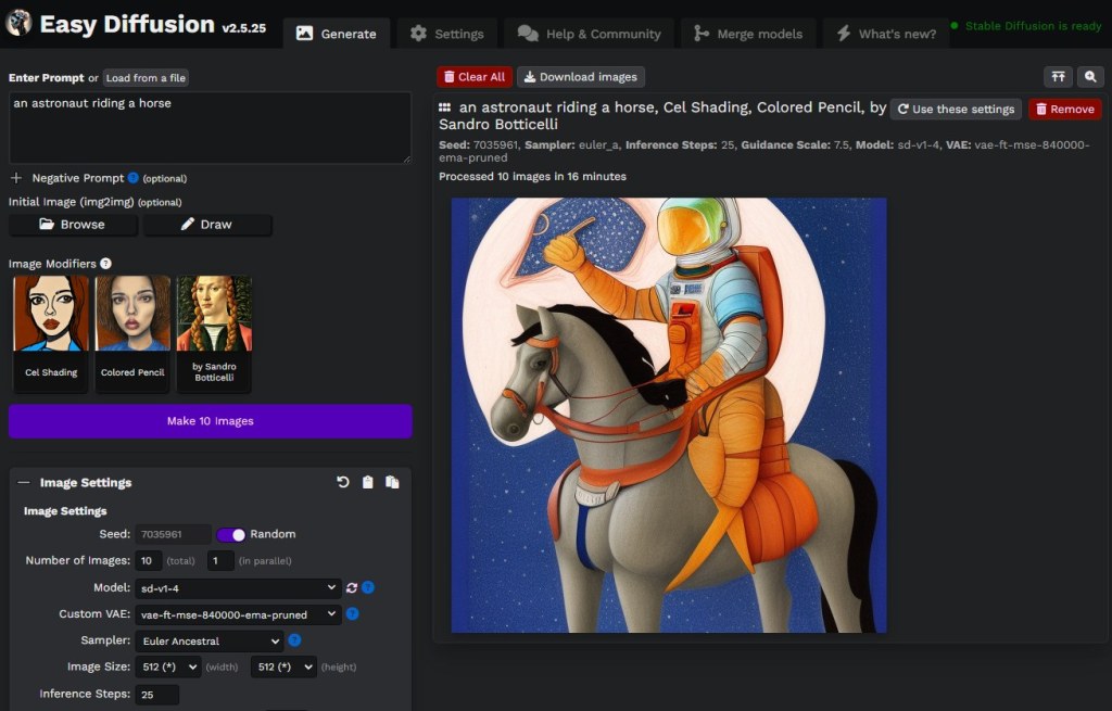 Easy Diffusion es una distribución fácil de instalar y usar de Stable Diffusion, el principal software de IA de texto a imagen de código abierto. Easy Diffusion instala todos los componentes de software necesarios para ejecutar Stable Diffusion además de su propia interfaz web fácil de usar y potente de forma gratuita, puede instalarse en Windows, Linux y Mac.