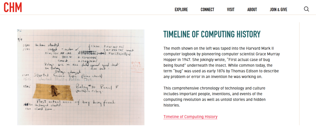 El sitio del museo CHM (Computer History Museum, de Mountain View, California) ofrece una línea de tiempo que es muy didáctica. Se puede explorar fácilmente para aprender algo nuevo sobre eventos, personas, documentos y artefactos clave en la historia de la informática. Observar que el contenido es en inglés solamente.